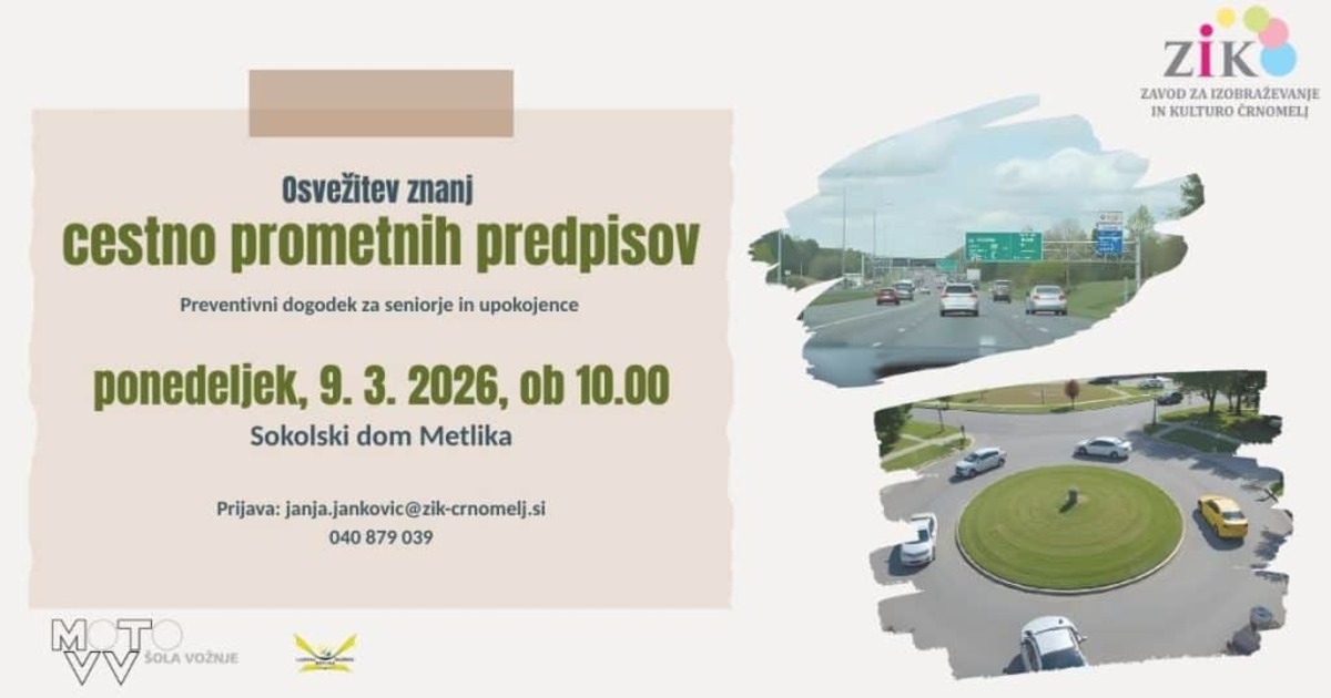 Vabljeni na brezplačno usposabljanje starejših voznikov, ki ga organizira Zavod za izobraževanje in kulturo Črnomelj, v sodelovanju z Moto Vv, šola vožnje Vladimir Vladič in Ljudsko knjižnico Metlika v ponedeljek, 9. marca 2026, ob 10.00 v Sokolskem domu Metlika.