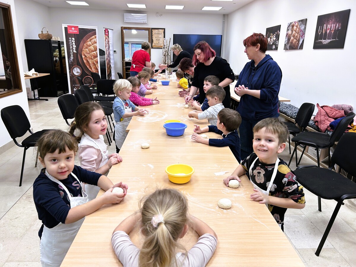 V Hiši dobrot je bilo danes še posebej živahno in dišeče. Otroci iz skupine Muce Otroškega vrtca Metlika so se z velikim navdušenjem preizkusili v peki pogač ter skozi praktično izkušnjo spoznavali delček naše kulinarične dediščine.