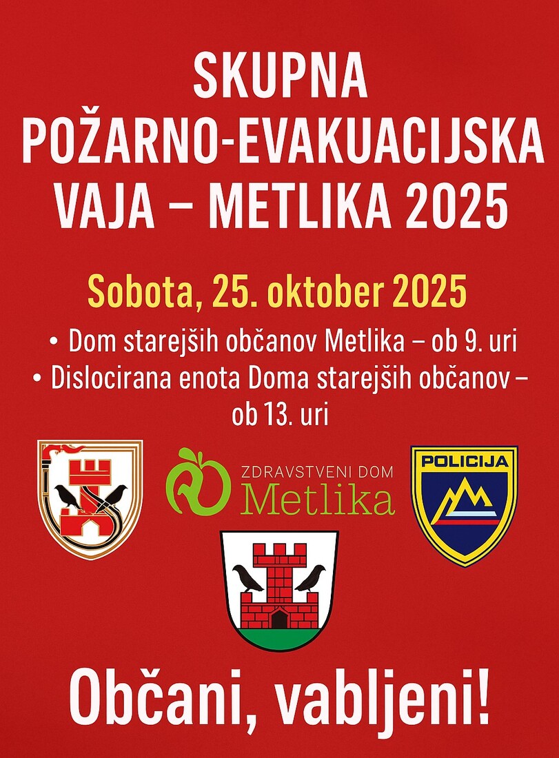 V soboto, 25. oktobra 2025, bodo združili moči Gasilska zveza Metlika, Zdravstveni dom Metlika in Policijska postaja Metlika ter izvedli "POŽARNO-EVAKUACIJSKO VAJO".