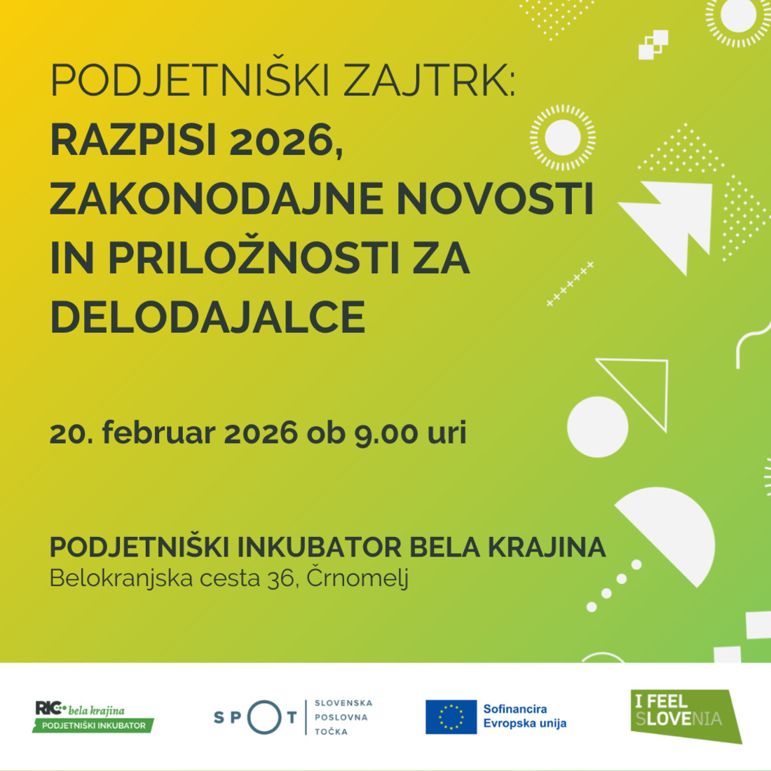 - 9.00 - 9.30: Predstavitev aktualnih in napovedanih razpisov za podjetja v letu 2026, zakonodajne novosti na področju normirancev (Barbara Vraničar, SPOT svetovalka).