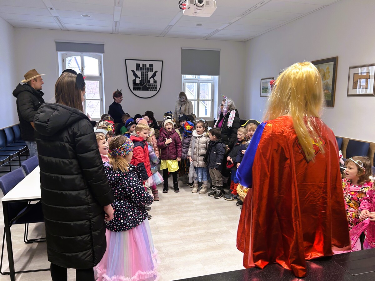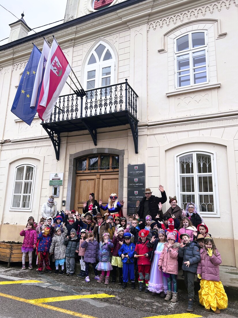 Obiskale so nas maškare iz Otroškega vrtca Metlika, ki so z raznolikimi kostumi, pesmijo in otroško razigranostjo poskrbele za prav posebno vzdušje. Občinske hodnike so napolnili princeske, vitezi, junaki in drugi domiselni liki ter za nekaj časa vsakdan zamenjali s pustno pravljico.