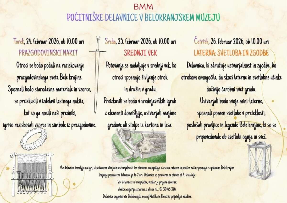 Vse delavnice temeljijo na igri, izkustvenem učenju in ustvarjalnosti ter otrokom omogočajo, da se na zabaven in poučen način spoznajo z zgodovino Bele krajine. Trajanje posamezne delavnice je do 2 uri. Delavnice so za otroke od 4.leta dalje.