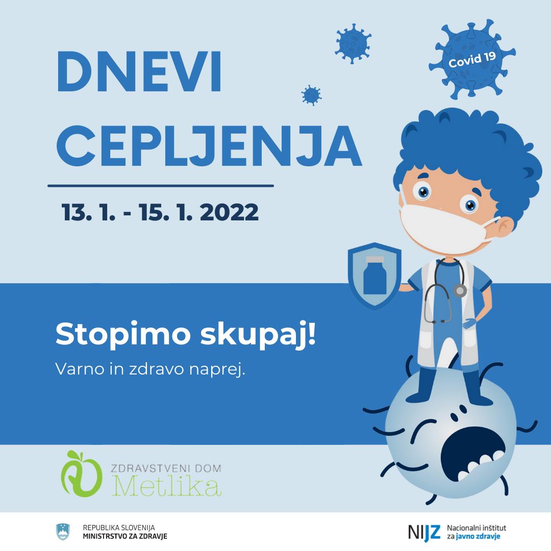 Dnevi cepljenja proti COVID-19 med 13. in 15. 1. 2022 v cepilnem centru ZD Metlika